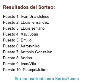 Lista de participantes: Antonio Gonzalez, Aaron/niko, Emilio, Andreu, Xavi/Joan, Ivan Brandolese, LLuis serrano, LLuis fernandez, Pinaqui/Julian, Ivan/Vila.