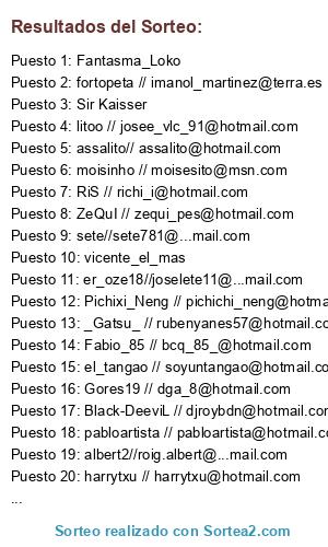 Lista de participantes: mescamilla, @Perdy_trs, @hintoni, @assalito, @er_makina1989, @osvaldito9, xXSeVi_STyLeXx, @dieguito_thebest, @lolito_er_crack, @chimeps3, @se_makiki_16, @david-olmedo, @imanol_martinez, vicente_el_mas, @navarrete_099, @israel_febrero, @cataproviciaos, luigi carras 89, @rubenyanes57, @michaelbacas, @rafana04, flakojmays, @jorgealaez, @fabro_3000, @cortex_xx, Sir Kaisser, @moisesito, @poletinho10, @ruben_bosch7, @zequi_pes, @Joselito_1003, @fernan_buco, @frias_01_liga, @dani_caseria, @iker-00, @roig.albert, @angelcop83, @ofabelo, @richi_89_16, @dj_trippy_sanfer, @daviddiaz81, @pabloartista, @richi_i, @djroybdn, @pipo_erica, @joselete11, @charly_shanero, @cielete_maria, @josee_vlc_91, @xdominx, @cokegol1984, @pichichi_neng, @marcgava, @sete781, @jesus_roney9, @dga_8, @manine_palma, @francis15pes, @ismaeljimva, @dimape23, beivi98 - beivi92hotmail.com, @iban_grao, @ruben_gv_69, @bcq_85_, @xori_12, @david.tillo, @soyuntangao, @fitipaldi_76, @jordiblay_93, @egidopau, @marlito12, @ravenn8, @sandovaliyo_87, Fantasma_Loko, @harrytxu, @amirdergic, @luis___1983, @amaro1982, @tistofer_3, @competicionespesps3.
