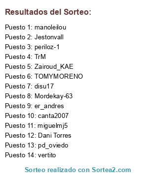 Lista de participantes: TOMYMORENO, Jestonvall, miguelmj5, Zairoud_KAE, Dani Torres, vertito, periloz-1, Mordekay-63, canta2007, disu17, er_andres, manoleilou, TrM, pd_oviedo.