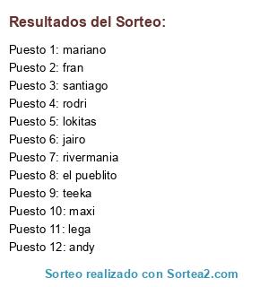 Lista de participantes: andy, lokitas, mariano, el pueblito, rodri, santiago, teeka, lega, fran, jairo, , .