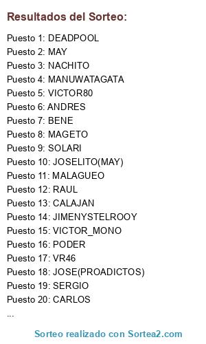 Lista de participantes: MANUWATAGATA, VR46, JOSE(PROADICTOS), SOLARI, DEADPOOL, VICTOR80, MAGETO, JESUS, ROBER, MAY, JIMENYSTELROOY, RAUL, BUBO_79, VICTOR_MONO, PASKU, MALAGUEO, CALAJAN, BENE, CARLOS, NACHITO, SERGIO, ANDRES, JOSELITO(MAY), PODER.