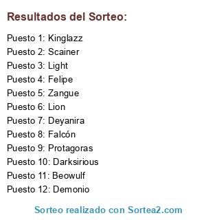 Lista de participantes: Scainer(2 participaciones), Felipe, Zangue, Lion(2 participaciones), Protagoras, Beowulf, Kinglazz, Deyanira, Falcón, Demonio, Light, Darksirious.