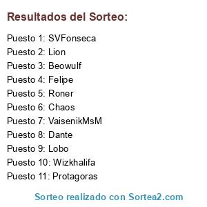 Lista de participantes: VaisenikMsM, Wizkhalifa, Lion(3 participaciones), Lobo, Roner, SVFonseca, Chaos(2 participaciones), Beowulf, Felipe, Dante, Protagoras.