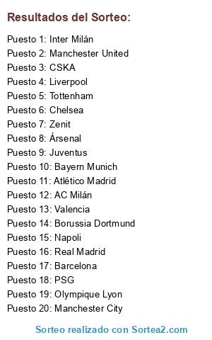 Lista de participantes: Barcelona, Real Madrid, Manchester City, Manchester United, Liverpool, Zenit, Bayern Munich, Chelsea, Inter Milán, PSG, Ársenal, AC Milán, Juventus, Napoli, Tottenham, Valencia, Atlético Madrid, Borussia Dortmund, Olympique Lyon, CSKA.