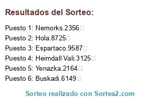 Lista de participantes: Yagle.1475 (6), Infrrod.4763 (6), Kenas.6749 (2), Richter.8526 (4), Orbatos.8367 (6), Draos.6947 (3), anaisha adlc.7241 (2), Quim.7203 (1), Lykros.2058 (6), Kisaro.1456 (6), Armeny.2143 (1), Gattuso.1094 (6), Khaju.7241 (6), Desoyador de Ratas.4038 (6), Buskadi.6149 (6), Arrow.8617 (6), Midadami.2167 (6), Nemorks.2356 (2), khriss.1569 (1), crauling.6892 (1), Yenazka.2164 (6), Korhal.2476 (1), Dan.5623 (2), Elyrien.4712 (2), Espartaco.9587 (6), GranYog.9624 (1), NiceBowJob.9308 (1), Ansunamu.3894 (3), Blanxi.8560 (6), Zisco Breizhlander.9034 (6), RReena.3169 (2), Hola.8725 (6), saarth.7824 (2), Juman.7289 (1), nar.6082 (1), Joan.2384 (6), Damyanoff.4527 (1), JimGar.4078 (1), Saleen.1597 (2), Azavel.4298 (2), Heimdall Vali.3125 (6), Tina Ocoy.9463 (6), Amergin Ogham.4679 (6), freakshow.5620 (1), Rejectz.2854 (1), Ryunthar.1450 (3), SasakiHaisex.5168 (1), Bertranch.1035 (1).