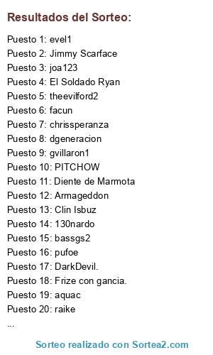 Lista de participantes: dgeneracion, elrapidonicolas, shamain, pufoe, evel1, PITCHOW, Frize con gancia., El Soldado Ryan, M.Abrams, gvillaron1, Clin Isbuz, Diente de Marmota, andfla2007, texbar, chrissperanza, joa123, luigis78, theevilford2, osvaldodelsouc, gerbar95, raike, Jhon Canpero, Jimmy Scarface, demon7, facun, DarkDevil., 130nardo, bassgs2, Desenfunda23, Huber Anibal, Armageddon, Bala asesina, aquac.