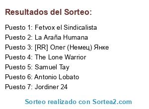 Lista de participantes: Antonio Lobato(10), Fetvox el Sindicalista(200), Lionel Messi(10), Jordiner 24(5), La Araña Humana(10), The Lone Warrior(10), Samuel Tay(20), Dregor(1), [RR] Олег (Немец) Янке(10).
