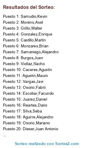 Lista de participantes: Aguirre,Alejandro, Agustin,Mauro, Burgos,Juan, Caceres,Agustin, Castillo,Martin, Dieser,Juan Antonio, Escobar,Facundo, Gonzalez,Enrique, Grillo,Walter, Juarez,Daniel, Luis,Jorge, Luque,Matte, Monzares,Brian, Moreno,Axel, Osorio,Fabrii, Osorio,Mariano, Pampii,Nahuu, Reartes,Dario, Saboldelli,Juancho, Samaniego,Alejandro, Samudio,Kevin, Silva,Seba, Vargas,Javi, Viollaz,Nacho.