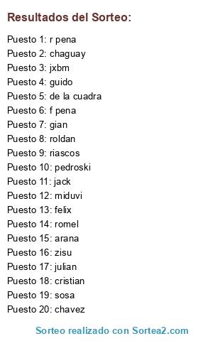 Lista de participantes: jack, jxbm, r pena, f pena, miduvi, pedroski, arana, sosa, zisu, julian, felix, guido, romel, roldan, riascos, de la cuadra, chaguay, cristian, gian, chavez.