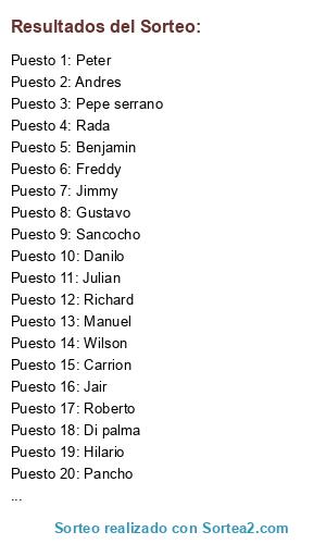 Lista de participantes: Andres, Brooks, Carrillo, Carrion, Danilo, Di palma, Freddy, Gregorio, Hilario, Jair, Jimmy, Jorge, Jose romero, Julian, Oscar, Pancho, Parra, Roberto, Primex, Peter, Rada, Rafa, Richard, Roman, Rossman, Pepe serrano, Sancocho, Wilson, Manuel, Benjamin, Gustavo, Washington.