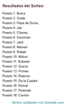 Lista de participantes: Buma, Carrión, Chavez,, Davichsin, De la Cuadra, Guido, Jack, Jair, Manuel, Miduvi, Pedroski, Pepe de Sucre,, Primex, Quiroz, Rafael, Riascos, Roberto, Romel.
