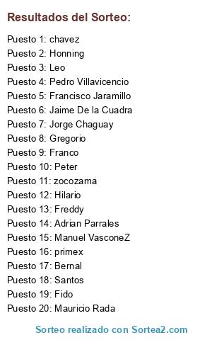 Lista de participantes: Francisco Jaramillo, Jorge Chaguay, Manuel VasconeZ, Fido, Hilario, Gregorio, Leo, Bernal, Franco, Santos, Honning, Mauricio Rada, Adrian Parrales, Jaime De la Cuadra, primex, zocozama, chavez, Freddy, Pedro Villavicencio, Peter.