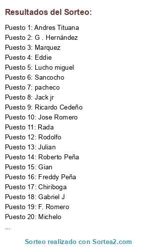 Lista de participantes: carlos torres, camilo torres, danilo cardenas, jxbm1987, pedroski, darieliin, romel, chavez, manuel, jack, cristian, diego, primex, miduvi, rios, chaguay, de la cuadra, guido, ganador repechaje, riascos.