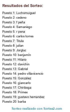 Lista de participantes: carlos torres, Primex, Luchomuiguel, Samaniego, Hilario, f peña, r pena, Chiriboga, Jorgluc, Gabriel, Titula, González, barba, cedeno, benjamín, davichin, julian, pedro villavicencio, gustavo hernandez, giancarlo.