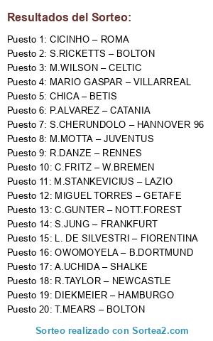 Lista de participantes: MIGUEL TORRES – GETAFE, MARIO GASPAR – VILLARREAL, CHICA – BETIS, M.WILSON – CELTIC, L. DE SILVESTRI – FIORENTINA, P.ALVAREZ – CATANIA, CICINHO – ROMA, M.STANKEVICIUS – LAZIO, M.MOTTA – JUVENTUS, S.JUNG – FRANKFURT, S.CHERUNDOLO – HANNOVER 96, C.FRITZ – W.BREMEN, A.UCHIDA – SHALKE, DIEKMEIER – HAMBURGO, OWOMOYELA – B.DORTMUND, R.DANZE – RENNES, C.GUNTER – NOTT.FOREST, R.TAYLOR – NEWCASTLE, S.RICKETTS – BOLTON, T.MEARS – BOLTON.