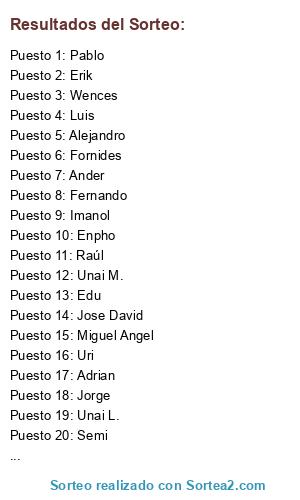 Lista de participantes: Fernando, Unai M., Alejandro, Erik, Wences, Adrian, Jorge, Imanol, Enpho, Limón, Ander, Unai L., Jose David, Raúl, Pablo, Uri, Edu, Luis, Miguel Angel, Fornides, Semi, Dani.