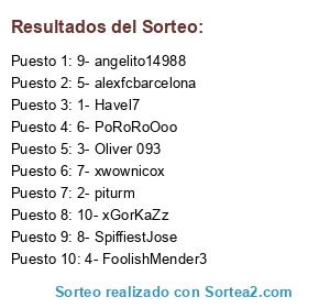 Lista de participantes: 1- Havel7, 2- piturm, 3- Oliver 093, 4- FoolishMender3, 5- alexfcbarcelona, 6- PoRoRoOoo, 7- xwownicox, 8- SpiffiestJose, 9- angelito14988, 10- xGorKaZz.