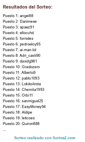 Lista de participantes: Aldipe, Adri_casti90, Josedvd89, ai-man-lol, enpho, Joryserso, pablo1093, Midaniel3, Danimese, Quiron888, Gons10, francisb04, fornides, apaez91, wazo, referee_21, pedroeloy95, danicozarch_25, mangel.sl, EduCM, Chemita1993, Orbi11, leticoes, JJDS8892, angei88, sito46, davidg981, alexmar_93, ellocuhd, JonanPB8, Uve_mula, sanmiguel25, Franciskiyo, EasyMoney94, Lokikolirota, pombokiller, jaimegx_94, Gradozero, Sánchez, Alberto9.