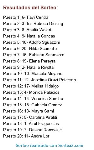 Lista de participantes: 1- Azul Fragancias, 2- Natalia Rivolta, 3- Iris Rebeca Diesing, 4- Monica Palacios, 5- Carolina Airaldi, 6- Favi Central, 7- Daiana Ronsvalle, 8- Analia Wolert, 9- Natalia Concas, 10- Marcela Moyano, 11- Andre Lor, 12- Josefina Orazi Petersen, 13- Mayra Sami, 14- Veronica Sancho, 15- Gabriela Gomez, 16- Fabiana Sanmarco, 17- Melisa Hidalgo, 18- Adolfo Sguazzini, 19- Elena Pereyra, 20- Nilda Scarcello.