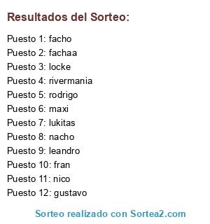 Lista de participantes: locke, facho, lukitas, maxi, nacho, gustavo, fran, leandro, rivermania, rodrigo, nico, fachaa.