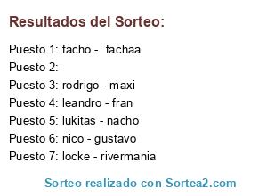 Lista de participantes: facho - fachaa, locke - rivermania, rodrigo - maxi, lukitas - nacho, leandro - fran, nico - gustavo, .