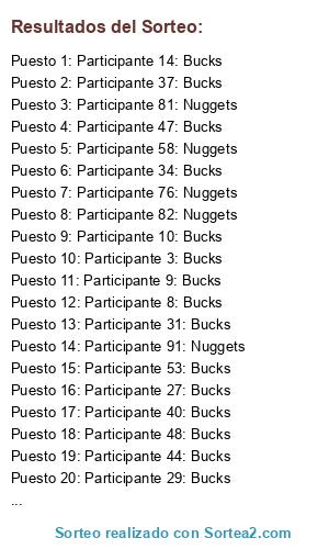 Lista de participantes: Participante 1: Bucks, Participante 2: Bucks, Participante 3: Bucks, Participante 4: Bucks, Participante 5: Bucks, Participante 6: Bucks, Participante 7: Bucks, Participante 8: Bucks, Participante 9: Bucks, Participante 10: Bucks, Participante 11: Bucks, Participante 12: Bucks, Participante 13: Bucks, Participante 14: Bucks, Participante 15: Bucks, Participante 16: Bucks, Participante 17: Bucks, Participante 18: Bucks, Participante 19: Bucks, Participante 20: Bucks, Participante 21: Bucks, Participante 22: Bucks, Participante 23: Bucks, Participante 24: Bucks, Participante 25: Bucks, Participante 26: Bucks, Participante 27: Bucks, Participante 28: Bucks, Participante 29: Bucks, Participante 30: Bucks, Participante 31: Bucks, Participante 32: Bucks, Participante 33: Bucks, Participante 34: Bucks, Participante 35: Bucks, Participante 36: Bucks, Participante 37: Bucks, Participante 38: Bucks, Participante 39: Bucks, Participante 40: Bucks, Participante 41: Bucks, Participante 42: Bucks, Participante 43: Bucks, Participante 44: Bucks, Participante 45: Bucks, Participante 46: Bucks, Participante 47: Bucks, Participante 48: Bucks, Participante 49: Bucks, Participante 50: Bucks, Participante 51: Bucks, Participante 52: Bucks, Participante 53: Bucks, Participante 54: Bucks, Participante 55: Bucks, Participante 56: Bucks, Participante 57: Bucks, Participante 58: Nuggets, Participante 59: Nuggets, Participante 60: Nuggets, Participante 61: Nuggets, Participante 62: Nuggets, Participante 63: Nuggets, Participante 64: Nuggets, Participante 65: Nuggets, Participante 66: Nuggets, Participante 67: Nuggets, Participante 68: Nuggets, Participante 69: Nuggets, Participante 70: Nuggets, Participante 71: Nuggets, Participante 72: Nuggets, Participante 73: Nuggets, Participante 74: Nuggets, Participante 75: Nuggets, Participante 76: Nuggets, Participante 77: Nuggets, Participante 78: Nuggets, Participante 79: Nuggets, Participante 80: Nuggets, Participante 81: Nuggets, Participante 82: Nuggets, Participante 83: Nuggets, Participante 84: Nuggets, Participante 85: Nuggets, Participante 86: Nuggets, Participante 87: Nuggets, Participante 88: Nuggets, Participante 89: Nuggets, Participante 90: Nuggets, Participante 91: Nuggets, Participante 92: Nuggets, Participante 93: Nuggets, Participante 94: Nuggets, Participante 95: Nuggets.