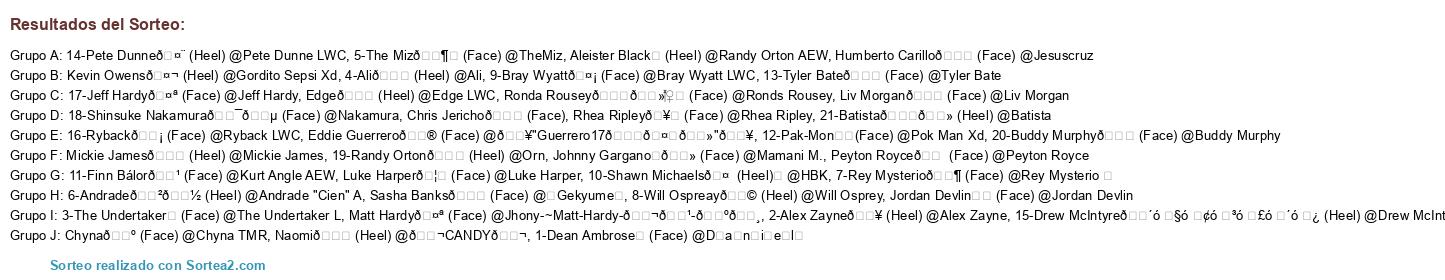 Lista de participantes: 1-Dean Ambrose⚡ (Face) @D̷a̷n̷i̷e̷l̷, 2-Alex Zayne💥 (Heel) @Alex Zayne, 3-The Undertaker⚰ (Face) @The Undertaker L, 4-Ali😉 (Heel) @Ali, 5-The Miz🕶️ (Face) @TheMiz, 6-Andrade🇲🇽 (Heel) @Andrade "Cien" A, 7-Rey Mysterio🌶 (Face) @Rey Mysterio , 8-Will Ospreay🎩 (Heel) @Will Osprey, 9-Bray Wyatt🤡 (Face) @Bray Wyatt LWC, 10-Shawn Michaels🤠 (Heel) @HBK, 11-Finn Bálor👹 (Face) @Kurt Angle AEW, 12-Pak-Mon☠️(Face) @Pok Man Xd, 13-Tyler Bate🏏 (Face) @Tyler Bate, 14-Pete Dunne🤨 (Heel) @Pete Dunne LWC, 15-Drew McIntyre🏴 (Heel) @Drew McIntyre, 16-Ryback😡 (Face) @Ryback LWC, 17-Jeff Hardy🤪 (Face) @Jeff Hardy, 18-Shinsuke Nakamura🇯🇵 (Face) @Nakamura, 19-Randy Orton🐍 (Heel) @Orn, 20-Buddy Murphy😃 (Face) @Buddy Murphy, 21-Batista👊🏻 (Heel) @Batista, Luke Harper🦅 (Face) @Luke Harper, Edge😏 (Heel) @Edge LWC, Jordan Devlin❄️ (Face) @Jordan Devlin, Aleister Black⚫ (Heel) @Randy Orton AEW, Kevin Owens🤬 (Heel) @Gordito Sepsi Xd, Eddie Guerrero🌮 (Face) @🔥"Guerrero17👀🤘🏻"🔥, Matt Hardy🤪 (Face) @Jhony-~Matt-Hardy-🇬🇹-🇺🇸, Humberto Carillo😉 (Face) @Jesuscruz, Johnny Gargano✌🏻 (Face) @Mamani M., Chris Jericho🐐 (Face), Naomi🌈 (Heel) @🍬CANDY🍬, Peyton Royce👠 (Face) @Peyton Royce, Mickie James😌 (Heel) @Mickie James, Rhea Ripley🥊 (Face) @Rhea Ripley, Ronda Rousey🏋🏻♀️ (Face) @Ronds Rousey, Liv Morgan💜 (Face) @Liv Morgan, Chyna👺 (Face) @Chyna TMR, Sasha Banks💖 (Face) @❎Gekyume❎.