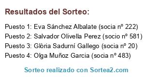 Lista de participantes: Glòria Sadurní Gallego (socia nº 20), Sandra Sales (socia nº 111), Elizabeth Teixidor Pujol (socia nº 55), Susana Grau Aubert (socia nº 647), Paqui Montes Artacho (socia nº 573), Eva Sánchez Albalate (socia nº 222), Rosa Marina de Acuña Tost (socia nº 246), Salvador Olivella Perez (socio nº 581), Olga Muñoz Garcia (socia nº 483).
