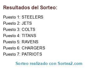 Lista de participantes: PATRIOTS, RAVENS, COLTS, STEELERS, CHARGERS, JETS, TITANS.