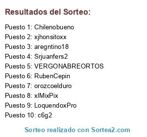 Lista de participantes: pedror17, mcrobby, Chilenobueno, OLOVOL, xXNeXXosHDXx, SexyItachi98, xxMETALERO96xx, Bangarang10, LoquendoxPro, ronitalpapi, zorroonline , Sikariogdl , pedrito3434, zlModesteplz , XxXxileonXxX , elishane1, luis00x , banedarko, neymar10234 , iD:naisteper13 , SrNumeroSr , the1pirate , aregntino18 , xmetralleta , FIFAWORLD9 , Rami334, trancuz, 1998jefry122 , oberag , newstylepipe , Sarjento26, wolfraptor, kodavido12, Desmadre67, Ayu9913 , Iguano123, Giedjipe, skrillex1253, xMordekayxS4, luizsalazar, Pezzia1, amadeus24, afrika5555, 72858110, Rauldiazzz, c6g2, davidcase1, jacaroooo1, PabloPachec0, craazyfun, adan7777777, rpg04, qlogeeeyy, taquigamer5 , lSeitoshil, yovnabezpz , JibennSteven, chris9919, zlAssasinSpeeD, xdluizzxd, fullxd301, marianos4xd, zxlkz, warnitobebe , sociorelaz , maxiubaldo, Pushiner2407, newcaliche, gabrieleyton, xcalibr3x, Gomelo12 , sdac2012 , raficoxd , ahioria, haskellsc, soypros10, xSPxYoSoyDavid, kanonx, JonathanL1, johan225412 , orozcoelduro , xxhectorxz, RubenCepin , deadend69, xdiegoxm79 , soyluis123, salir258147, losfigus1234 , matadornobo , kikin2004e , ikarlas2, procashpro, keko17bmx , sexbreak69, Srjuanfers2, loko2014, chalejito00, joseyluis185, rg4lfxo, bonborack , mvl28, sers2, 1112808, isincashs1, libreros1998, OlaSiyDeivy, isaac8610 , AlexisUrielM, devorador315 , xllDraGonikllx, xStyleHawkAk , haroldtoval20, juanfmx85, 1raziel1, chivax, quilindo1998, xjhonsitoxx, VERGONABREORTOS, Alconnegro88, lProStrikeR, pasesar214 , josemanriqu3 , molona, killer5c, franco0815, SrLoboPoli, xlMixPix, emiliosmak, EstebanGood, arango234, agsb, nicobnloqo, jesus4224, Miguel20031, imperiodx, critical99, GhostLogan, MARIN1173, necrotico666, chinothecapo, eamirvas , ID:crisalexxvm2, 1993ocelot, Id:werter000, thejairobmx, angelal1, ID:elcrt2013 , tons11, itzkarenyt, zllChauxllz, Alejauran , AlanNeryS2Lv , xfdsergiomac, cofrutos , dakatfm, joalediaz1, Jefeloko518 , scarlett11, ID:callofduty33, titanfallxxx, francok1, zeed11, josetrejos1, azalejoaznew, 722humberto, phantonkil , ID:jeffer12344, saxmuel10 , LCSgamer, walter20199, grety55, 102719 , carlosfortii , jloczar, ID:generalito2 , XXXhhhopanXXX , xnders.
