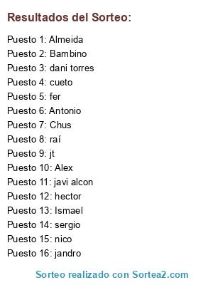 Lista de participantes: Antonio, Chus, Almeida, nico, raí, fer, Bambino, Ismael, jandro, Alex, dani torres, jt, javi alcon, hector, sergio, cueto.