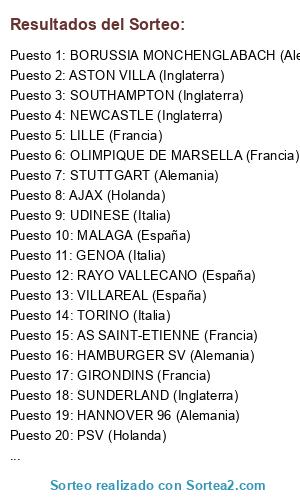 Lista de participantes: VILLAREAL (España), MALAGA (España), CELTA DE VIGO (España), RAYO VALLECANO (España), NEWCASTLE (Inglaterra), SOUTHAMPTON (Inglaterra), ASTON VILLA (Inglaterra), SUNDERLAND (Inglaterra), SPORTING CP (Portugal), OLIMPIQUE DE MARSELLA (Francia), LILLE (Francia), GIRONDINS (Francia), AS SAINT-ETIENNE (Francia), BORUSSIA MONCHENGLABACH (Alemania), HAMBURGER SV (Alemania), STUTTGART (Alemania), FRANKFURT (Alemania), HANNOVER 96 (Alemania), UDINESE (Italia), TORINO (Italia), GENOA (Italia), AJAX (Holanda), PSV (Holanda).