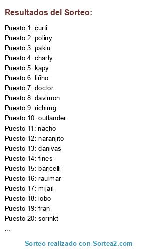 Lista de participantes: curti, valrojo, lobo, naranjito, nacho, charly, kapy, poliny, fran, davimon, outlander, raulmar, doctor, fines, petra, richimg, danivas, baricelli, mijail, sorinkt, pakiu, liñho.