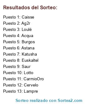 Lista de participantes: SKY, Saxo, Astana, Liquigas, Vacansoleil, Loulé, Cervelo, Katusha, Euskaltel, Caisse, Rabobank, Lotto, Burgos, Bbox, Acqua, Saur, Ag2r, Milram, Miche, CarmioOro, CCC, Quick-Step, Andronni, De Rosa, HTC-Columbia, Lampre.