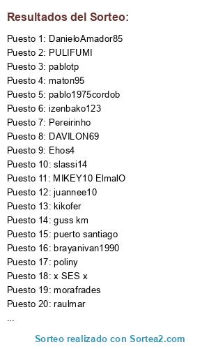 Lista de participantes: MigueCR7, Jff_vlc, Fidinho10, Samu, Davidgc79, Prk_25, Aritz-96, Pyro_jojumar, Nacaan, Manuelrs2, Sandrosamba10, Pablosouto, Pacheta, Fixius--qp, Becksmontana, Barreno.