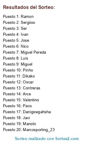 Lista de participantes: Sergiioo, Luis, Nico, Miguel, Ivan, Arce, Manolo, Jose, Paco, Marcosporting_23, Pinho, Miguel Pereda, Ser, Javi, Danigswgahsha, Oscar, Ramon, Valentino, Dikako, Contreras.