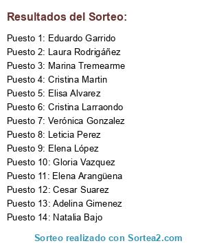 Lista de participantes: Elisa Alvarez, Leticia Perez, Cristina Larraondo, Elena Arangüena, Eduardo Garrido, Cesar Suarez, Cristina Martin, Verónica Gonzalez, Natalia Bajo, Marina Tremearme, Adelina Gimenez, Elena López, Gloria Vazquez, Laura Rodrigáñez.