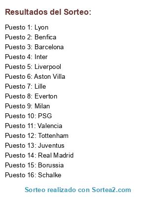 Lista de participantes: Valencia, Milan, Inter, PSG, Juventus, Everton, Aston Villa, Lille, Borussia, Real Madrid, Schalke, Barcelona, Liverpool, Lyon, Tottenham, Benfica.