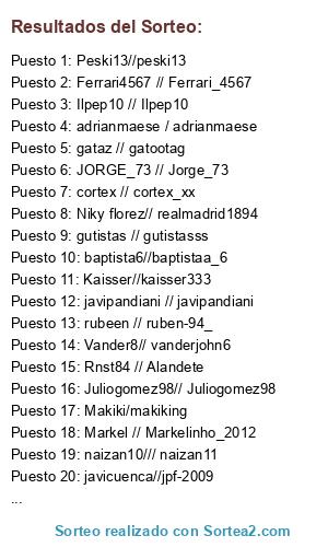 Lista de participantes: cortex // cortex_xx, javipandiani // javipandiani, Alicate / alicate9, adrianmaese / adrianmaese, gutistas // gutistasss, Makiki/makiking, naizan10/// naizan11, rubeen // ruben-94_, Peski13//peski13, JORGE_73 // Jorge_73, baptista6//baptistaa_6, Rnst84 // Alandete, javicuenca//jpf-2009, Markel // Markelinho_2012, Vander8// vanderjohn6, Niky florez// realmadrid1894, Kaisser//kaisser333, Ferrari4567 // Ferrari_4567, Juliogomez98// Juliogomez98, Ilpep10 // Ilpep10, gataz // gatootag, piporuiz // DRR10.