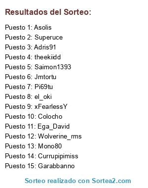 Lista de participantes: Blackgorg, Kaizher, Alvaroox16, Juanka, Reelo, Jhorgamer, Danieliyo, Damiolp, Jaime, Lolo, Pipita_14, Cao20, Spajorge, Ajnoi, Max_Mayonesa.