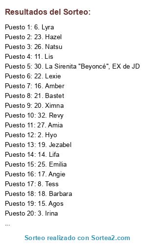 Lista de participantes: 1. JM, 2. Hyo, 3. Irina, 4. Cam, 5. Cinder, 6. Lyra, 7. Lysa, 8. Tess, 9. Morag, 10. Sarah, 11. Lis, 12. Lia, 13. Freya, 14. Lifa, 15. Agos, 16. Amber, 17. Angie, 18. Barbara, 19. Jezabel, 20. Ximna, 21. Bastet, 22. Lexie, 23. Hazel, 24. Anya, 25. Emilia, 26. Natsu, 27. Amia, 28. Sheera (mi nueva chica sorpresa... aunque aún no tengo claro su nombre), 29. Kyu, 30. La Sirenita "Beyoncé", EX de JD, 31. Duma, 32. Revy.