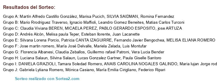 Lista de participantes: Florencia Albanesi, Vera Lucia Bender, Fernando Javier Bengochea, Claudia Viviana BEREN, Patricia CANTA IZAGUIRRE, Mónica Casiano, María Emilia Cirigliano, María José Delvalle, Romina Fernandez, Leandro Gomez Beneites, DANIELA GRAZIOLI, Maria lujan Jorge rodriguez, Esteban llorente, Ignacio Maffioli, ANAIS CAROLINA NOGALES GALINDO, Guillermo rafael Patroni, Silvana Lorena Porcio, Marisa Pucich, Tamara Soledad Romero, Gabriela Lyliana Romero, Jose martin romero, MELISA ELIANA ROMERO, SILVIA SAIDMAN, Luciana Salaun, Silvina Salaun, Paula Giselle Santoro, Melisa paula Teper, Matias Carlos Turconi, Mario Rrodriguez Traverso, Federico Ripari, Claudia Zeballos, Lucas Gonzalez Gartner, Martín Alfredo Castillo González, MICAELA PEREZ, PABLO GERARDO ESPOSITO, Mariela Zelada, jose ARTUZA, Juan Lacanette, Luis Montufar, Andrés Alcón.