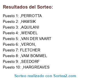 Lista de participantes: FLETCHER, ,AQUILANI, ,VAN DER VAART, ,PERROTTA, ,SEEDORF, ,HAMSIK, ,HARGREAVES, ,VAM BOMMEL, ,WENDEL, ,VERON,.