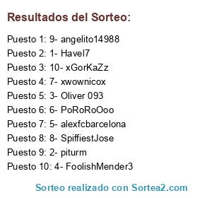 Lista de participantes: 1- Havel7, 2- piturm, 3- Oliver 093, 4- FoolishMender3, 5- alexfcbarcelona, 6- PoRoRoOoo, 7- xwownicox, 8- SpiffiestJose, 9- angelito14988, 10- xGorKaZz.