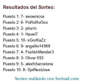 Lista de participantes: 1- Havel7, 2- piturm, 3- Oliver 093, 4- FoolishMender3, 5- alexfcbarcelona, 6- PoRoRoOoo, 7- xwownicox, 8- SpiffiestJose, 9- angelito14988, 10- xGorKaZz.