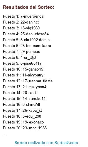 Lista de participantes: 1-kikee_25, 2-chuli-chuli, 3-chinoAll, 4-er_t0j3, 5-edu_298, 6-jose68117, 7-mueroencai, 8-ola1992-domin, 9-toonino, 10-ivanmu7, 11-alvypatry, 12-toribio93, 13-titokameni, 14-franuko14, 15-ganso15, 16-el_lentejas, 17-juanma_fiesta, 18-vlg1980, 19-lexonaco, 20-caicf, 21-makynon4, 22-daninct, 23-jmnr_1988, 24-regnumllion, 25-dani-efese84, 26-kapa_ct, 27-Paulstar1010, 28-tomeumckarra, 29-pempus, 30-luxury9.