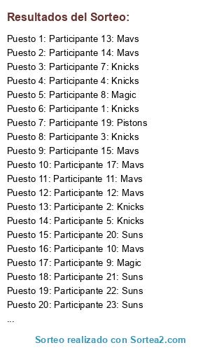 Lista de participantes: Participante 1: Knicks, Participante 2: Knicks, Participante 3: Knicks, Participante 4: Knicks, Participante 5: Knicks, Participante 6: Knicks, Participante 7: Knicks, Participante 8: Magic, Participante 9: Magic, Participante 10: Mavs, Participante 11: Mavs, Participante 12: Mavs, Participante 13: Mavs, Participante 14: Mavs, Participante 15: Mavs, Participante 16: Mavs, Participante 17: Mavs, Participante 18: Pistons, Participante 19: Pistons, Participante 20: Suns, Participante 21: Suns, Participante 22: Suns, Participante 23: Suns.