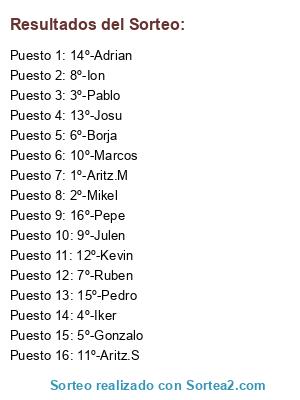Lista de participantes: 1º-Aritz.M, 2º-Mikel, 3º-Pablo, 4º-Iker, 5º-Gonzalo, 6º-Borja, 7º-Ruben, 8º-Ion, 9º-Julen, 10º-Marcos, 11º-Aritz.S, 12º-Kevin, 13º-Josu, 14º-Adrian, 15º-Pedro, 16º-Pepe.