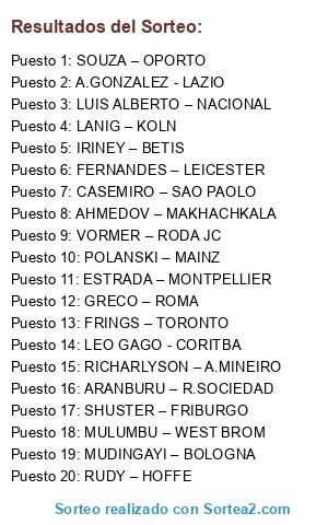 Lista de participantes: MUDINGAYI – BOLOGNA, CASEMIRO – SAO PAOLO, FERNANDES – LEICESTER, MULUMBU – WEST BROM, VORMER – RODA JC, LUIS ALBERTO – NACIONAL, ARANBURU – R.SOCIEDAD, IRINEY – BETIS, POLANSKI – MAINZ, ESTRADA – MONTPELLIER, LEO GAGO - CORITBA, RICHARLYSON – A.MINEIRO, SHUSTER – FRIBURGO, LANIG – KOLN, RUDY – HOFFE, SOUZA – OPORTO, AHMEDOV – MAKHACHKALA, FRINGS – TORONTO, GRECO – ROMA, A.GONZALEZ - LAZIO.