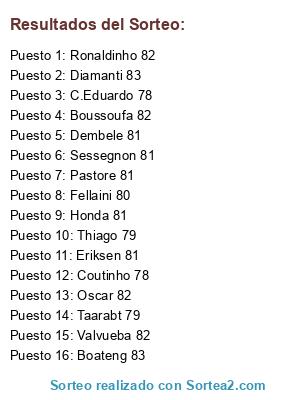 Lista de participantes: Boateng 83, Diamanti 83, Ronaldinho 82, Boussoufa 82, Valvueba 82, Oscar 82, Eriksen 81, Honda 81, Pastore 81, Dembele 81, Sessegnon 81, Fellaini 80, Taarabt 79, Thiago 79, Coutinho 78, C.Eduardo 78.